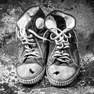 Old and worn working shoes in BW