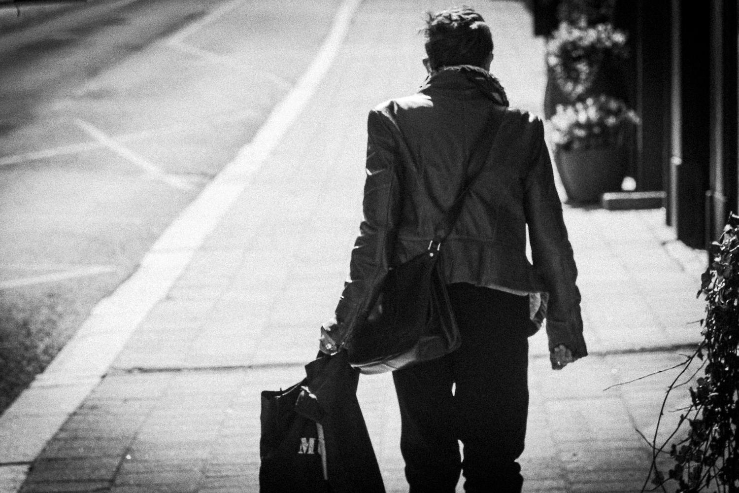 Man walking the street in Turku. Analog TriX film style